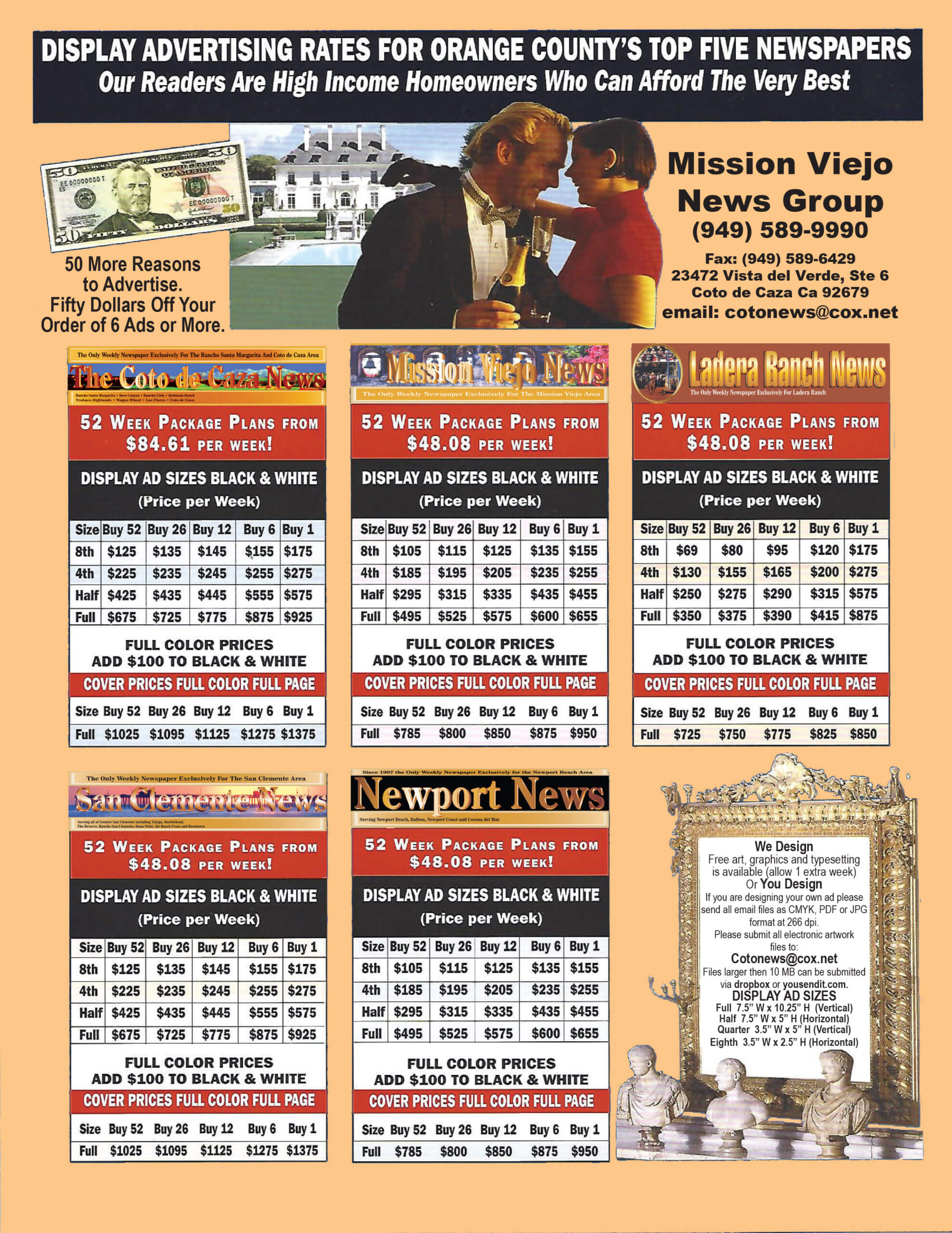 We are a local independent weekly newspaper group serving Orange County, published every Friday. We are not owned or operated by any of the big daily newspapers. The views and opinions expressed are those of the publisher and not any organization. No reproduction, in whole or in part is permitted without the express written permission of Orange County Newspapers. Legal Advertising: We have been adjudicated by the Orange County Superior Court as a newspaper of general circulation pursuant to Government Code 6000 case #A202554 on July 6, 2000 and as such is the appropriate newspaper to place legal and public notices for the Orange County Judicial Districts.